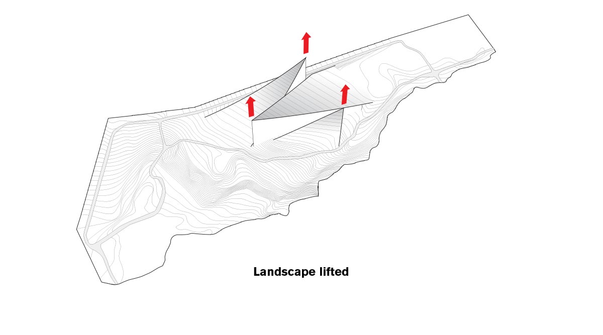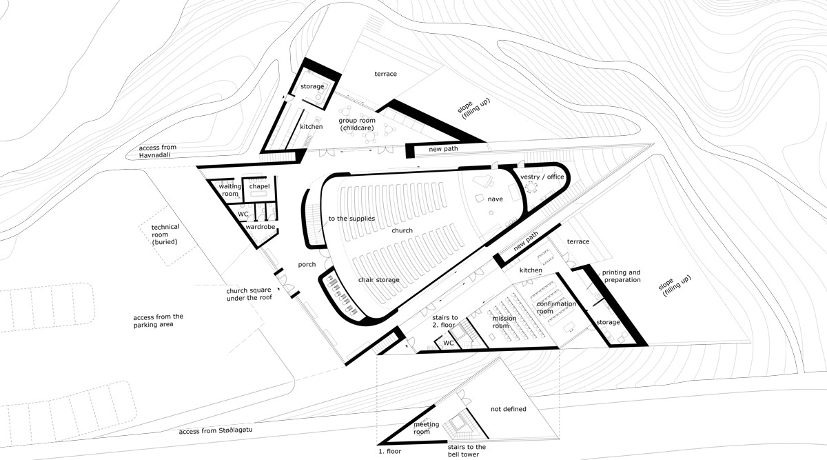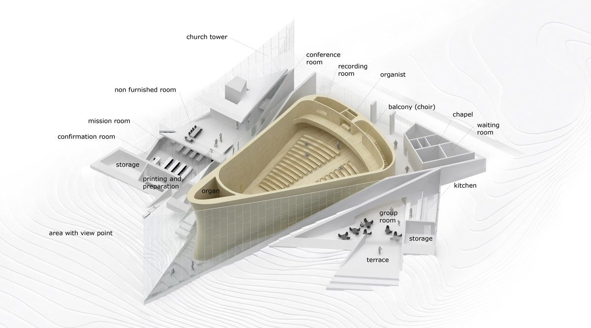 The site of the church is a natural river valley that the locals use as a recreational place within the city. The focus of the project was therefore to create a church that would fit naturally into the area and still allow people to use the river valley as a green and recreational place. With a simple starting point of hands folded in prayer, the project creates a church deeply integrated into the landscape and the surrounding paths.