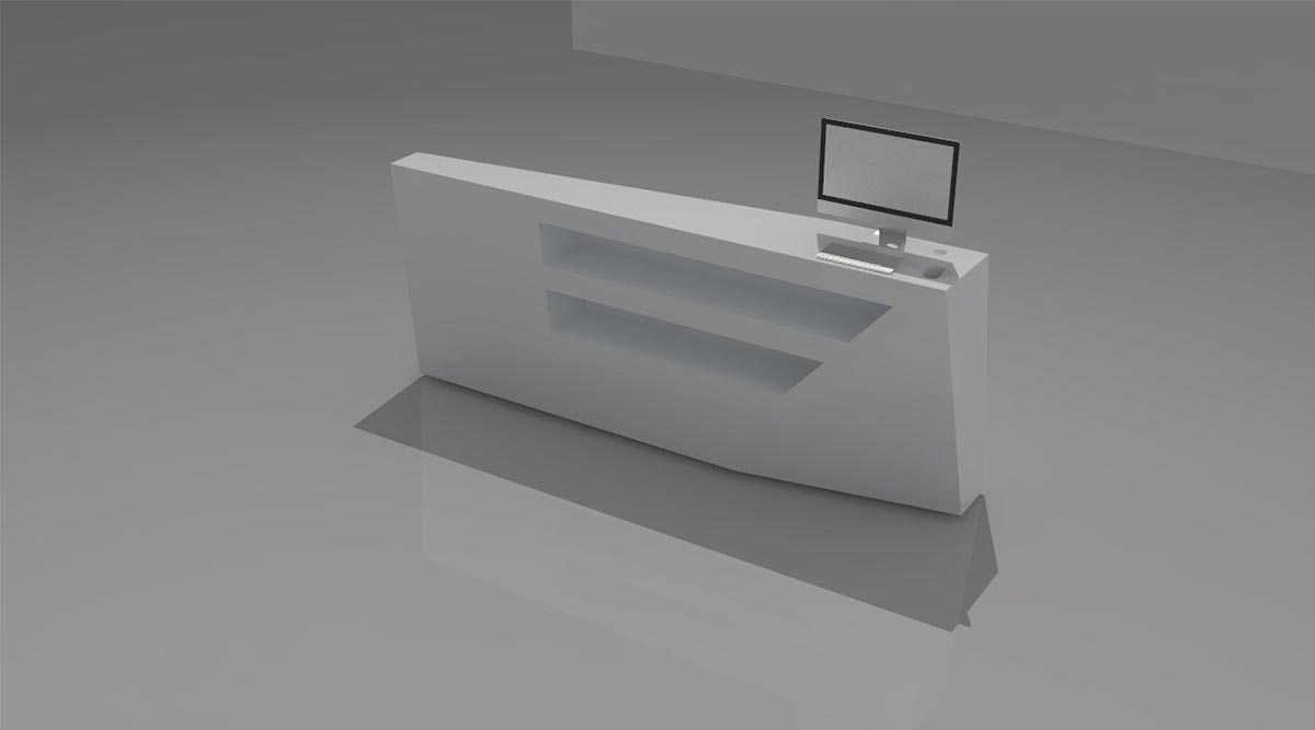 The retail counter is shape into an irregular, dynamic shape. On the back of the counter, three shelves are excavated from the shape.