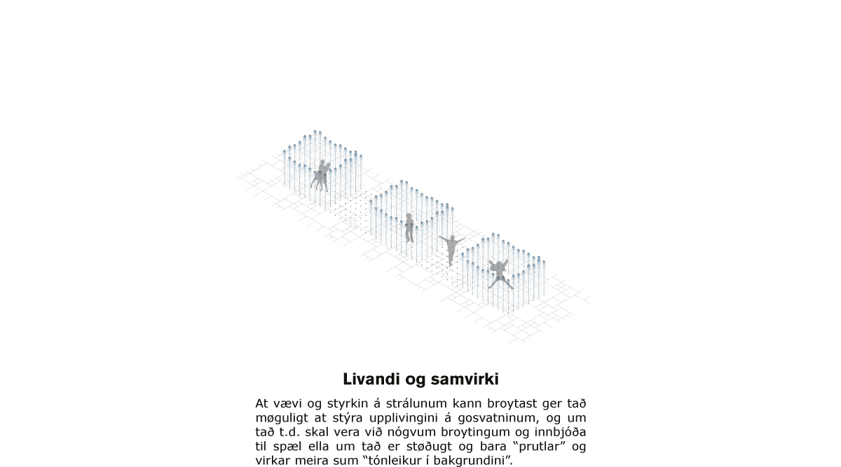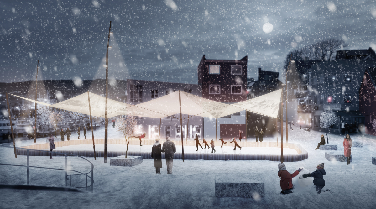 Torgið verður innrættað við 3 sløgum av broytiligum innbúgvi: hálvtak / telt, plintar og gosvatn. Hálvtaki verður fest á Corten-stál-mastrar, ið kunnu snarast upp og niður eftir tørvi. Støddin á hálvtakinum / teltinum kann varierast eftir tørvi.