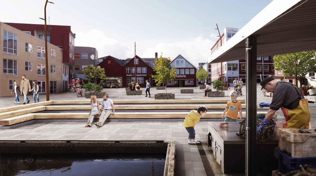 Torgið verður innrættað við 3 sløgum og plintum úr føroyskum gróti: ein uppihalds- og søluplintur, ið ikki er gjørdur til plantur. Hini sniðini eru bæði gjørt til heilt ella partvíst at innihalda smærri trø og plantur. Allir plintarnir eru gjørdir soleiðis, at teir kunnu flytast runt á torginum eftir tørvi. Hetta verður gjørt við plattalyftara.